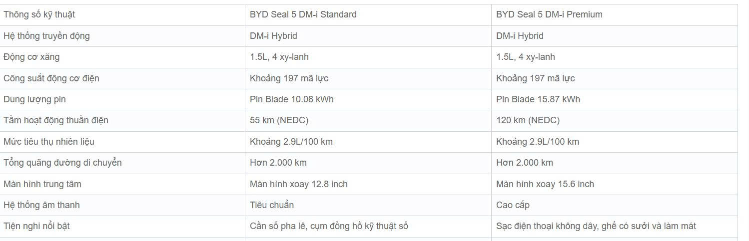 Bảng thông số kỹ thuật các phiên bản BYD Seal 5 2025: